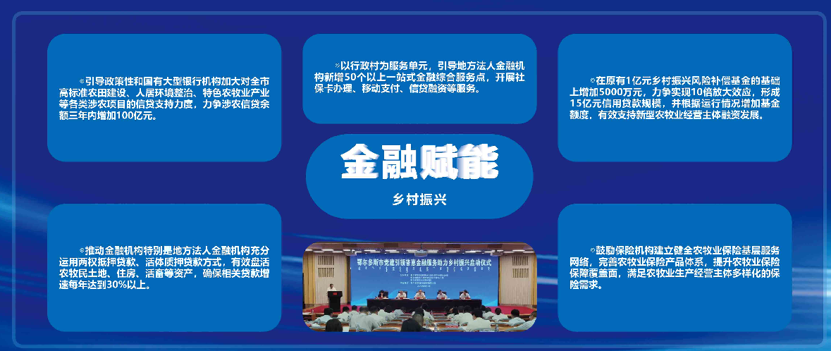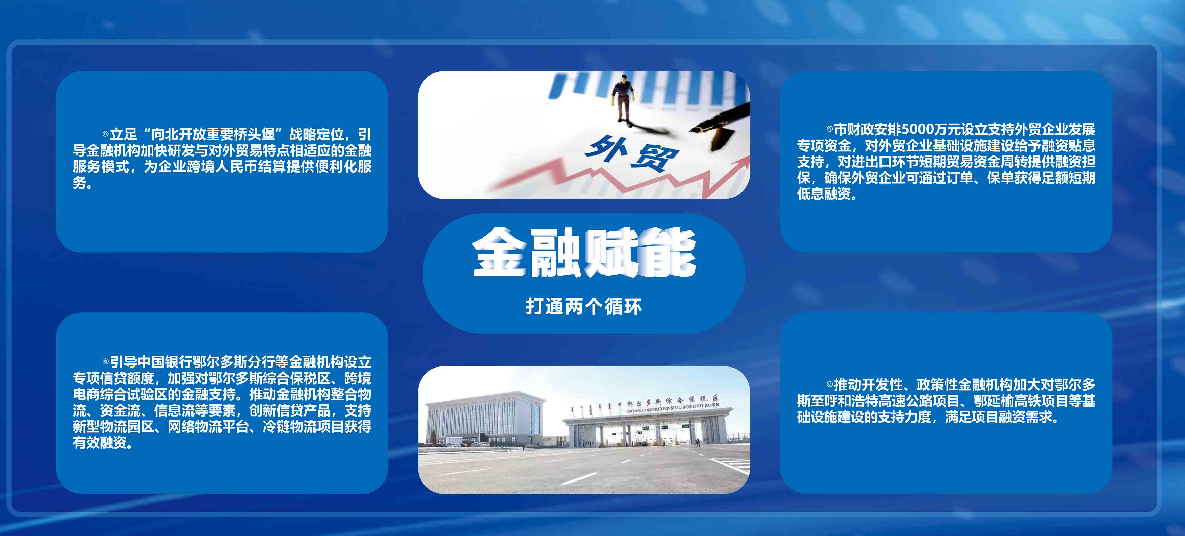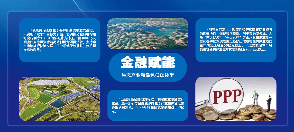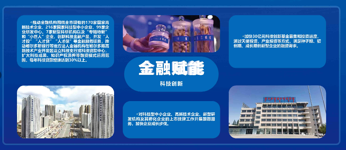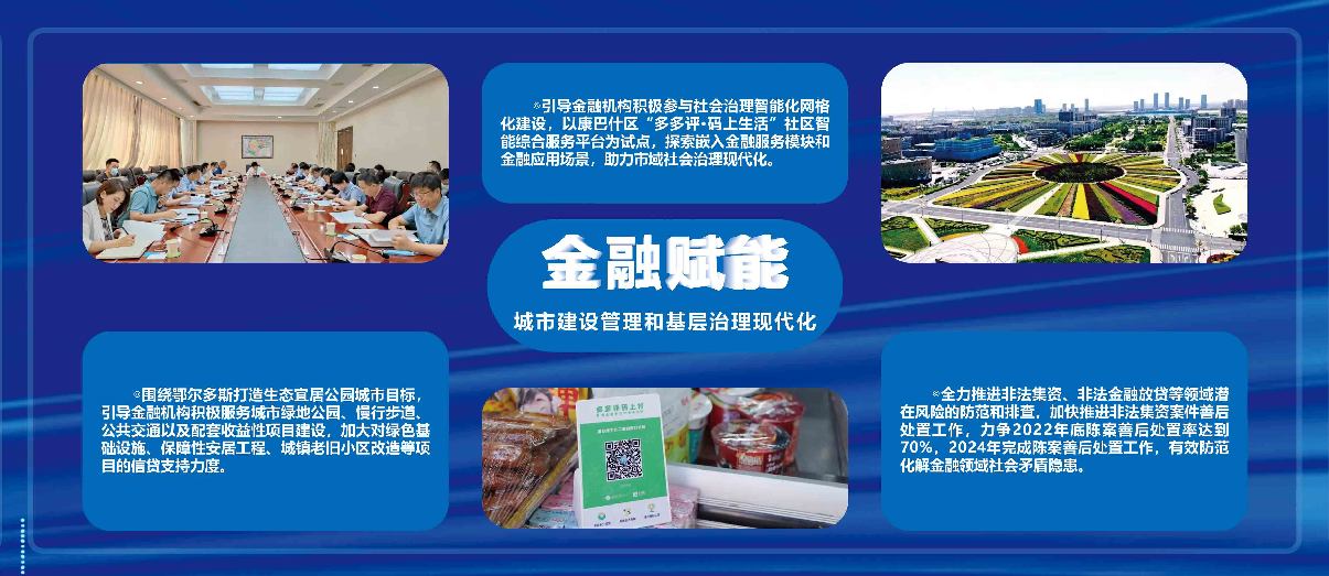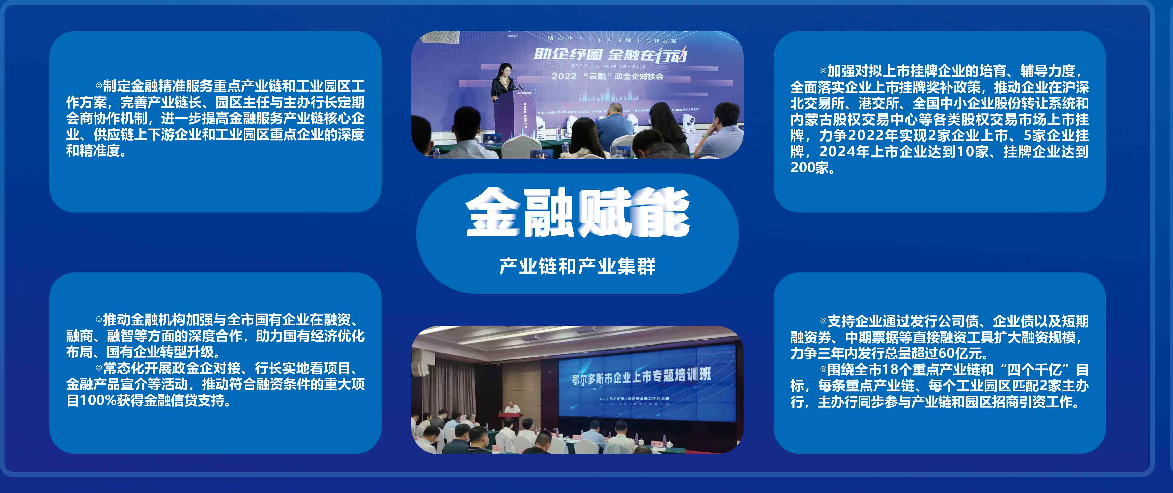 第三部分是重點(diǎn)任務(wù)。共十項(xiàng)。一是在賦能生態(tài)產(chǎn)業(yè)和綠色低碳轉(zhuǎn)型方面,以實(shí)現(xiàn)“雙碳”目標(biāo)為引領(lǐng),通過(guò)建立綠色金融地方標(biāo)準(zhǔn)、制定財(cái)政獎(jiǎng)補(bǔ)激勵(lì)政策、運(yùn)用貨幣政策支持工具,推動(dòng)金融機(jī)構(gòu)大力發(fā)展綠色金融,2024年綠色信貸余額超過(guò)500億元。同時(shí),通過(guò)銀團(tuán)貸款、PPP等方式,支持山水林田湖草沙系統(tǒng)治理以及礦山修復(fù)等生態(tài)產(chǎn)業(yè)項(xiàng)目三年內(nèi)實(shí)現(xiàn)融資60億元以上,“風(fēng)光氫儲(chǔ)車”等戰(zhàn)略性新興產(chǎn)業(yè)三年內(nèi)實(shí)現(xiàn)融資200億元以上。二是在賦能產(chǎn)業(yè)鏈和產(chǎn)業(yè)集群方面,為每條重點(diǎn)產(chǎn)業(yè)鏈、每個(gè)工業(yè)園區(qū)匹配2家主辦行,制定金融精準(zhǔn)服務(wù)重點(diǎn)產(chǎn)業(yè)鏈和工業(yè)園區(qū)工作方案,完善產(chǎn)業(yè)鏈長(zhǎng)、園區(qū)主任與主辦行長(zhǎng)定期會(huì)商協(xié)作機(jī)制,提高金融服務(wù)深度和精準(zhǔn)度。常態(tài)化開(kāi)展政金企對(duì)接、行長(zhǎng)實(shí)地看項(xiàng)目、金融產(chǎn)品宣介等活動(dòng),推動(dòng)符合融資條件的重大項(xiàng)目100%獲得金融信貸支持。力爭(zhēng)2022年實(shí)現(xiàn)2家企業(yè)上市、5家企業(yè)掛牌,2024年上市企業(yè)達(dá)到10家、掛牌企業(yè)達(dá)到200家。支持企業(yè)通過(guò)發(fā)行直接融資工具擴(kuò)大融資規(guī)模,力爭(zhēng)三年內(nèi)發(fā)行總量超過(guò)60億元。三是在賦能科技創(chuàng)新方面,引導(dǎo)金融機(jī)構(gòu)創(chuàng)新科技金融產(chǎn)品,開(kāi)發(fā)“人才投”“人才貸”“人才保”等金融服務(wù)項(xiàng)目,擴(kuò)大科技成果、知識(shí)產(chǎn)權(quán)質(zhì)押等融資模式運(yùn)用范圍,三年內(nèi)每年科技貸款增速達(dá)到30%以上。加快30億元科技創(chuàng)新基金募集和投資進(jìn)度,通過(guò)天使投資、產(chǎn)業(yè)投資等方式,滿足種子期、初創(chuàng)期、成長(zhǎng)期創(chuàng)新型企業(yè)的融資需求。四是在賦能普惠中小微市場(chǎng)主體活力方面,落實(shí)好普惠型小微企業(yè)貸款“兩增”目標(biāo),引導(dǎo)普惠型小微企業(yè)貸款利率三年內(nèi)下降0.6個(gè)百分點(diǎn)。推動(dòng)市融資擔(dān)保公司通過(guò)規(guī)范業(yè)務(wù)經(jīng)營(yíng)、提升核心資產(chǎn)質(zhì)量等方式,進(jìn)入自治區(qū)政府性融資擔(dān)保機(jī)構(gòu)名錄,實(shí)現(xiàn)與內(nèi)蒙古再擔(dān)保集團(tuán)、國(guó)家融資擔(dān)?;鸷痛笮蜕虡I(yè)銀行的業(yè)務(wù)合作,拓展擔(dān)保業(yè)務(wù)范圍、增強(qiáng)可持續(xù)擔(dān)保能力。多渠道籌資設(shè)立5億元三產(chǎn)服務(wù)業(yè)發(fā)展基金,開(kāi)展融資擔(dān)保、貼息和風(fēng)險(xiǎn)補(bǔ)償,將受疫情影響的商貿(mào)物流、批發(fā)零售、住宿餐飲等市場(chǎng)主體的綜合融資成本控制在5%以下。五是在賦能打通兩個(gè)循環(huán)方面,安排5000萬(wàn)元專項(xiàng)資金,給予外貿(mào)企業(yè)融資貼息和擔(dān)保支持。引導(dǎo)中國(guó)銀行等金融機(jī)構(gòu)設(shè)立專項(xiàng)信貸額度,強(qiáng)化對(duì)鄂爾多斯綜合保稅區(qū)、跨境電商綜合試驗(yàn)區(qū)的支持。推動(dòng)開(kāi)發(fā)性、政策性金融機(jī)構(gòu)加大對(duì)鄂爾多斯至呼和浩特高速公路項(xiàng)目、鄂延榆高鐵項(xiàng)目等基礎(chǔ)設(shè)施建設(shè)的支持力度。六是在賦能鄉(xiāng)村振興方面,引導(dǎo)政策性和國(guó)有大型銀行機(jī)構(gòu)加大對(duì)涉農(nóng)項(xiàng)目的信貸支持力度,力爭(zhēng)涉農(nóng)信貸余額三年內(nèi)增加100億元。在原有1億元鄉(xiāng)村振興風(fēng)險(xiǎn)補(bǔ)償基金基礎(chǔ)上再增加5000萬(wàn)元,力爭(zhēng)實(shí)現(xiàn)10倍放大效應(yīng),形成15億元信貸規(guī)模。推動(dòng)金融機(jī)構(gòu)特別是地方法人金融機(jī)構(gòu)充分運(yùn)用兩權(quán)抵押貸款、活體質(zhì)押貸款方式,有效盤活農(nóng)牧民土地、活畜等資產(chǎn),確保相關(guān)貸款增速每年達(dá)到30%以上。七是在賦能普惠民生方面,實(shí)行“政府+企業(yè)”雙管家服務(wù)模式,在市政務(wù)服務(wù)大廳設(shè)立金融服務(wù)中心,提供金融業(yè)務(wù)咨詢服務(wù)。引導(dǎo)金融機(jī)構(gòu)在醫(yī)療、養(yǎng)老、創(chuàng)業(yè)就業(yè)等方面加強(qiáng)合作,進(jìn)一步提升便捷金融服務(wù)。推動(dòng)各級(jí)政府為全市216.8萬(wàn)城鄉(xiāng)常住人口購(gòu)買政府救助保險(xiǎn),提供自然災(zāi)害、火災(zāi)爆炸、傳染病等方面的民生保險(xiǎn)保障。八是在賦能文旅消費(fèi)提檔升級(jí)方面,多渠道籌資設(shè)立3億元文旅產(chǎn)業(yè)發(fā)展專項(xiàng)基金,通過(guò)擔(dān)保、貼息等方式增加文旅產(chǎn)業(yè)有效信貸。推動(dòng)金融機(jī)構(gòu)在文旅消費(fèi)集中區(qū)設(shè)立營(yíng)業(yè)網(wǎng)點(diǎn)或ATM機(jī),滿足商戶和游客多樣化金融服務(wù)需求。推動(dòng)金融機(jī)構(gòu)與文旅部門聯(lián)合發(fā)行特色文旅信用卡、文旅消費(fèi)券,給予一定折扣優(yōu)惠,提升文旅消費(fèi)活躍度。九是